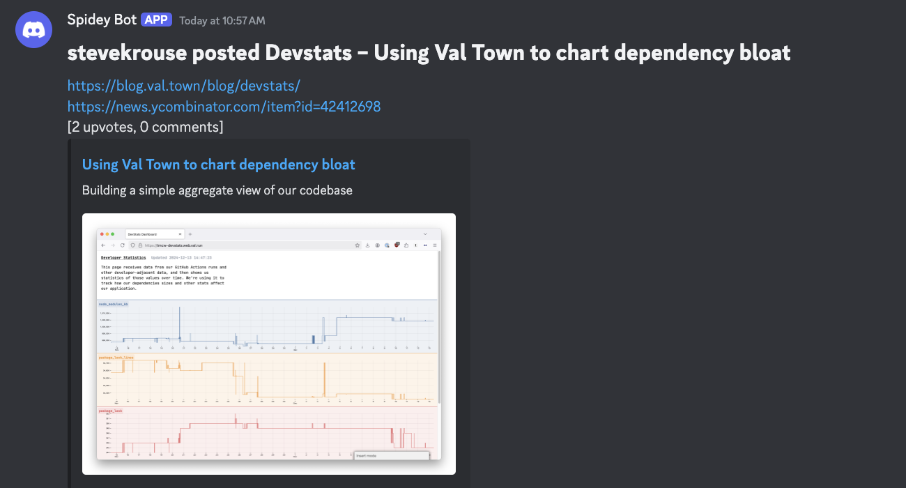 This val tracks mentions of "Val Town" on Hacker News and sends updates to a Discord webhook.