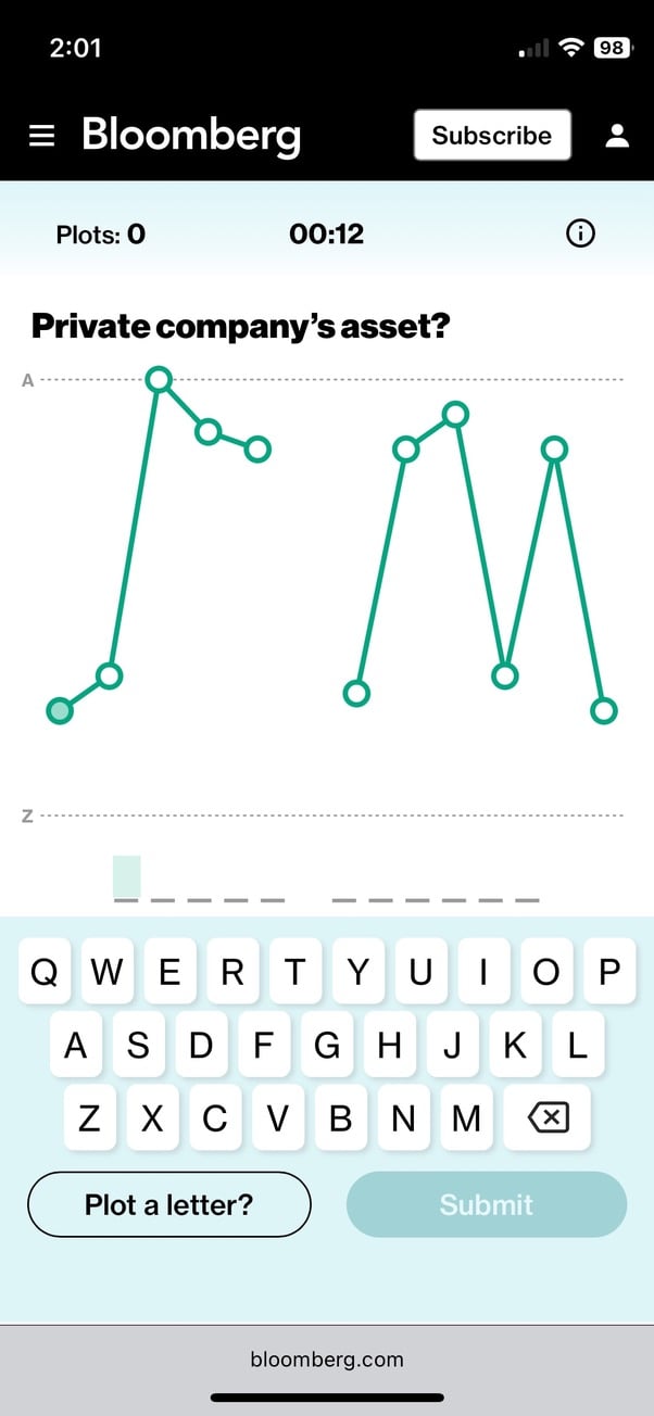 There were even more new entrants into the little daily word game racket in 2025. Bloomberg launched their Games section in September that included Alphadots, created by crossword constructor Jeff Chen. You are presented with a crossword-style question mark clue. And the letters are displayed in a line chart, ordered alphabetically along the Y-axis. Hints let you add horizontal baselines.