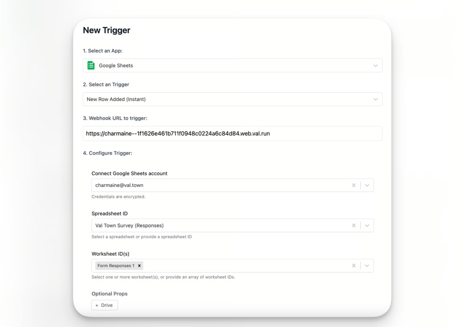 Configure Pipedream with Google Sheets "New Row" trigger here: https://pipedream.val.run/
