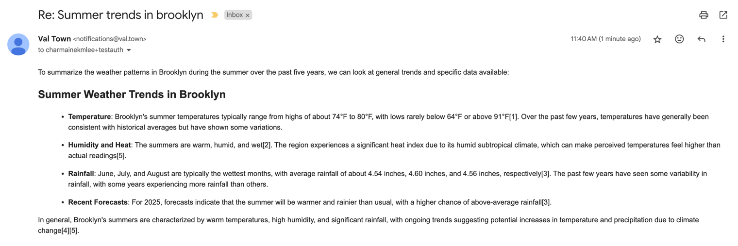 emailHandler: Send a question via email to your val's email address to get a response back via emailmorningAiNewsletter: A cron that sends you an email every morning (or whatever cadence you choose) telling you about the latest AI news.