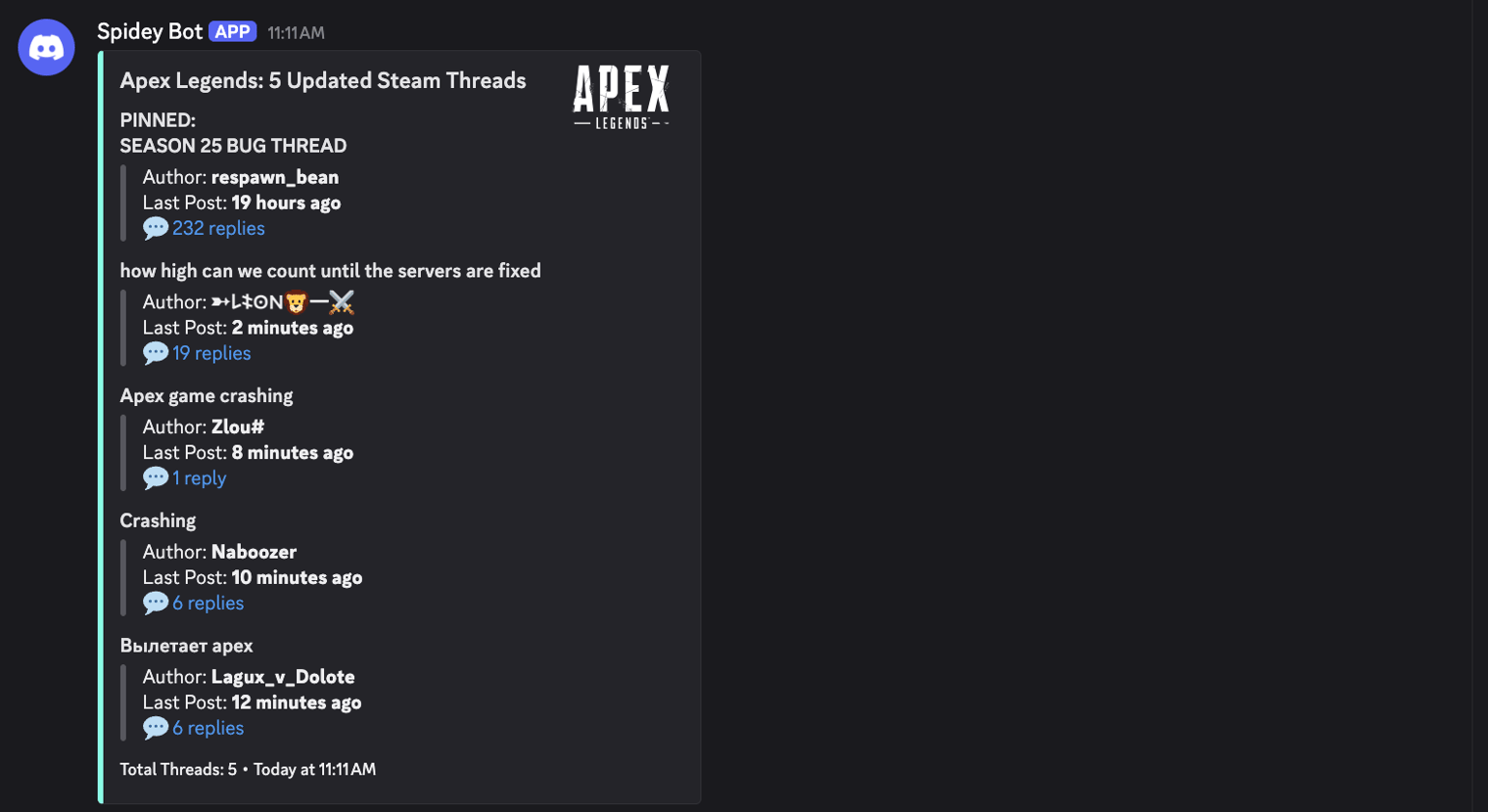 This script takes a Steam ID, Game Name, and array of discord webhook url destinations. It scans the main Steam community discussion page, and looks for new threads and threads with new comments, and then constructs a webhook with a configurable amount threads per hook, sending it to all configured destinations.
