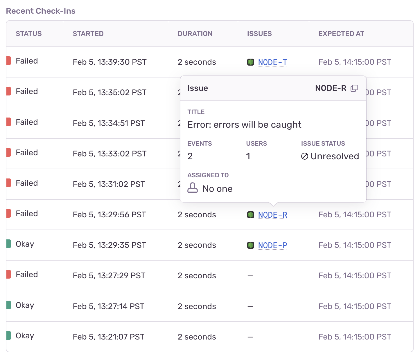 This val will automatically create and set up a Cron monitor in Sentry, and report all of your runs as check-ins. If your job ever misses a run or fails, Sentry will notify you.