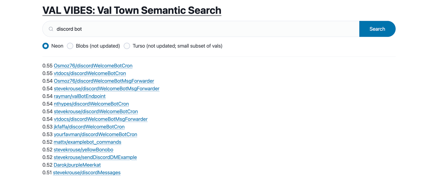 This val hosts an HTTP server that lets you search all vals based on vibes. If you search for "discord bot" it shows all vals that have "discord bot" vibes.