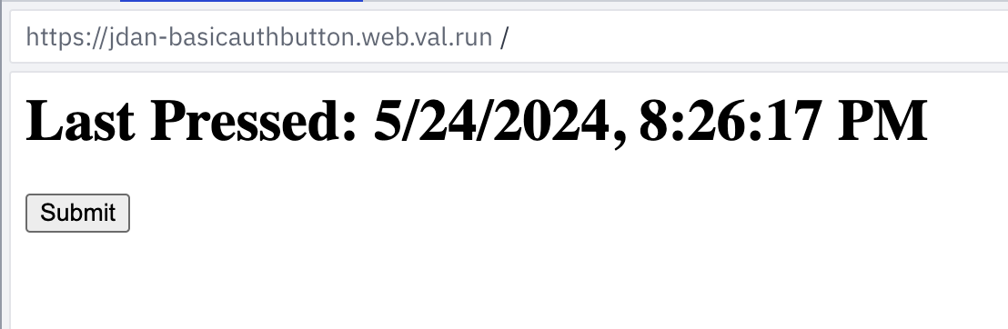 An authenticated micro-app for tracking the last time I took a medication. Both GET / and POST /press are authenticated using honoBasicAuthMiddleware.