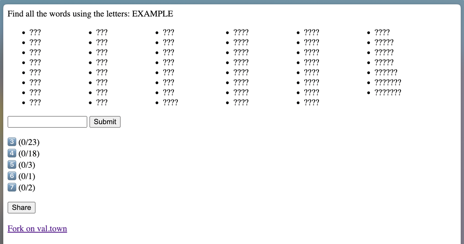 A wordgame inspired by TextTwist. Custom games can be created by appending the available letters to the url.