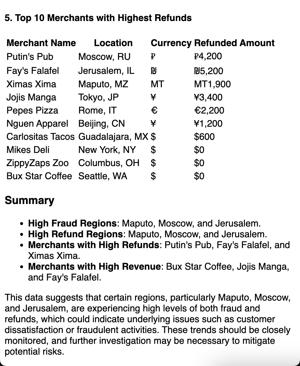 This agent is designed to find trends in merchant transaction reports, and produce a real time report.