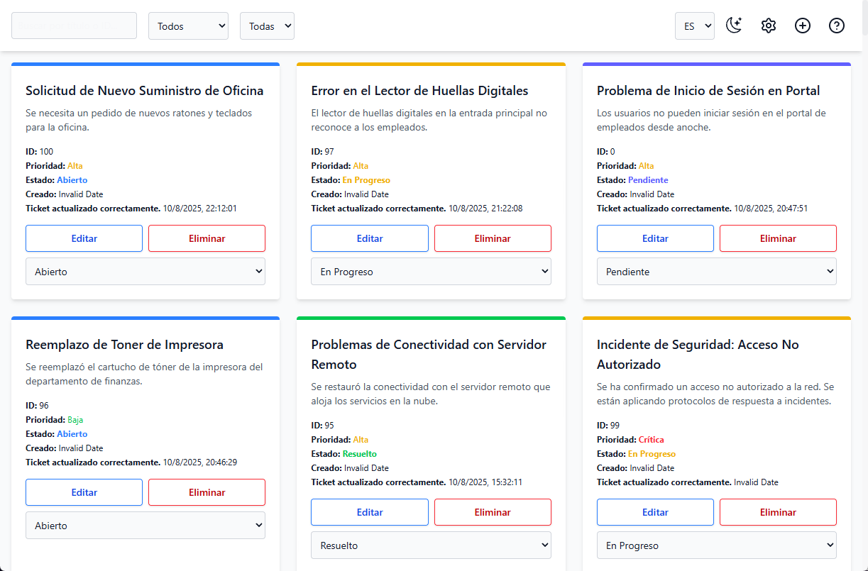 - Visualización de Tickets: Muestra una lista de todos los tickets existentes con su estado, prioridad y detalles.