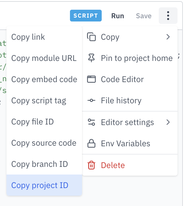 To get a project's UUID, navigating to any of it's files and use the copy id option in the context menu: