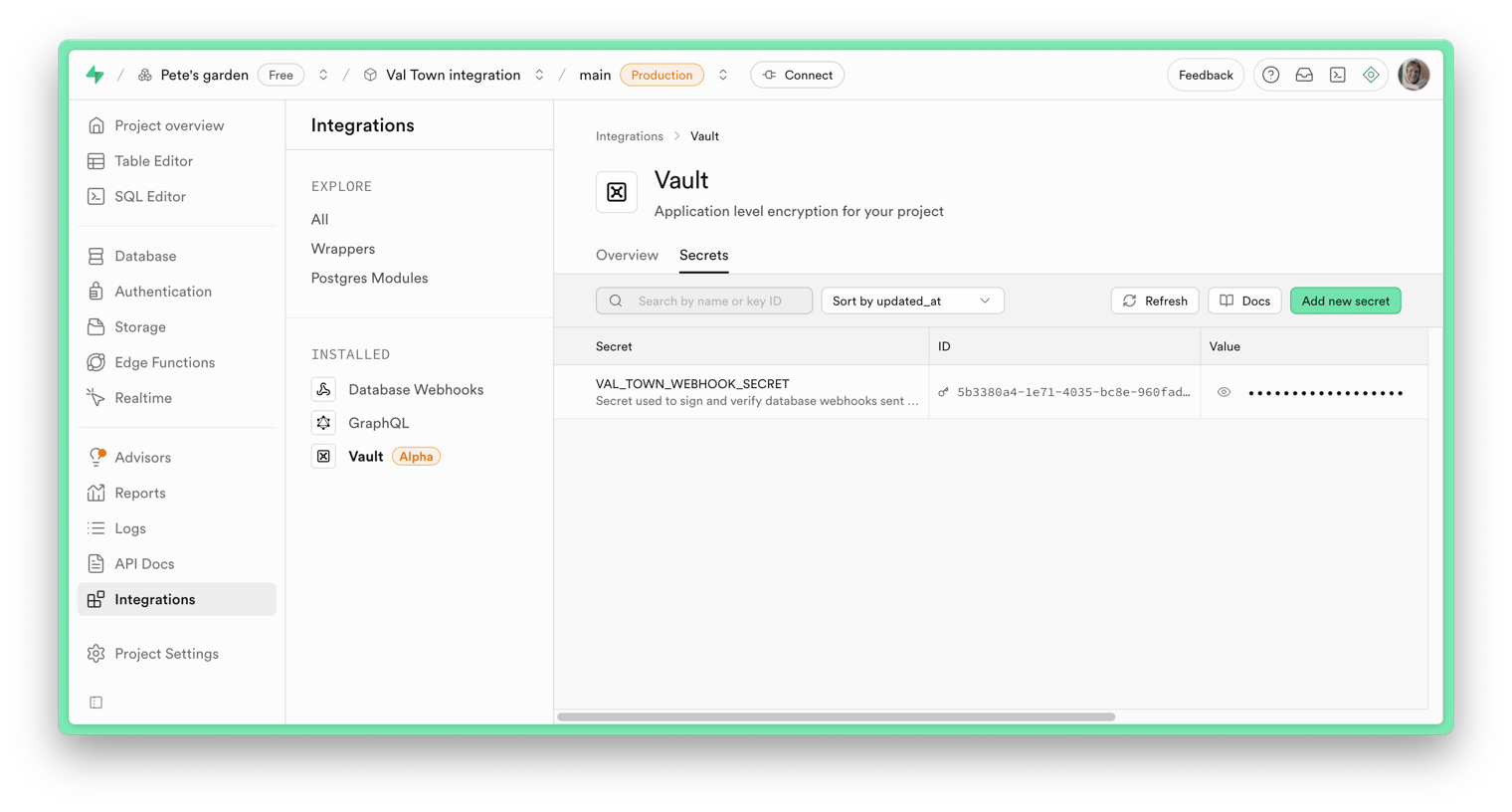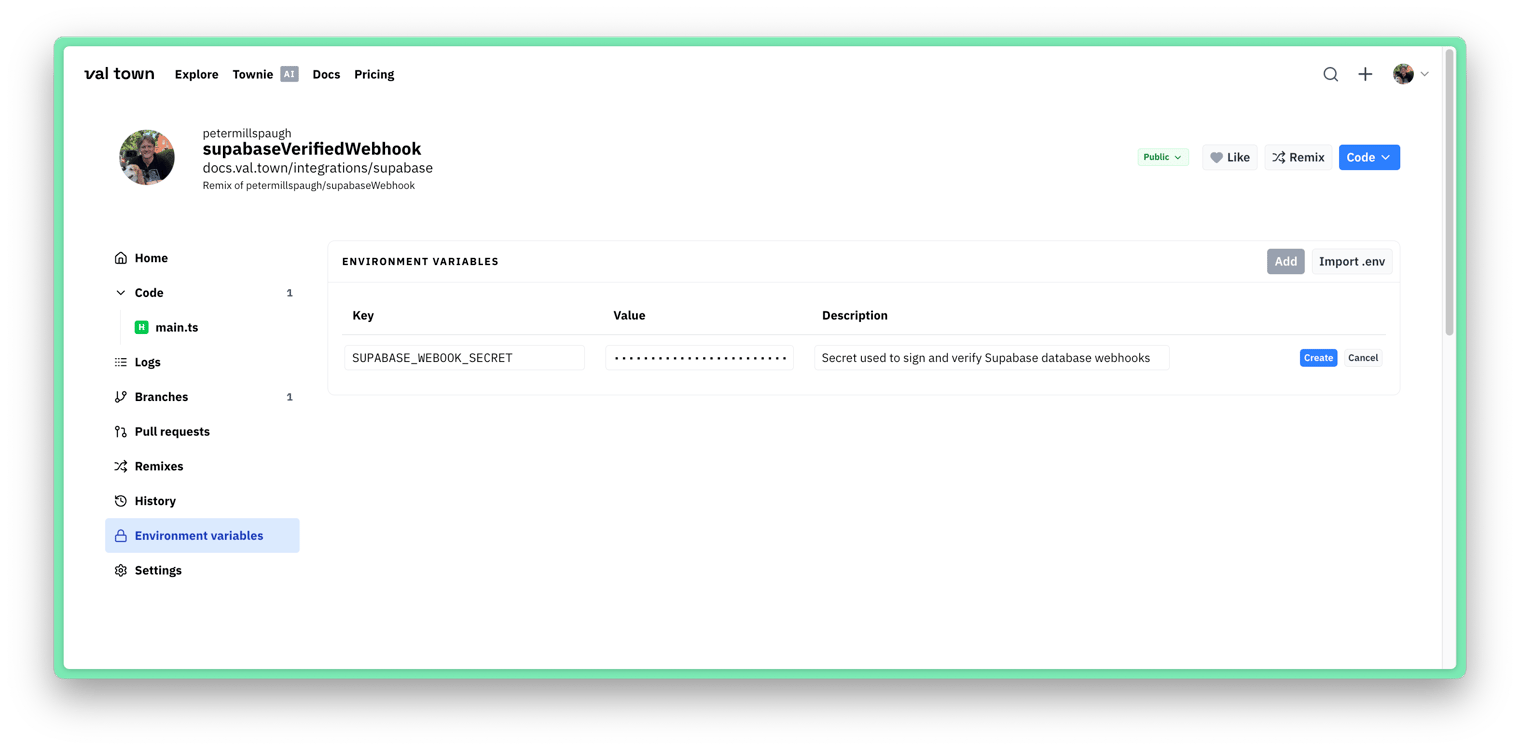 - Copy or remix this val to receive webhooks and verify the signature you just set up in Supabase
