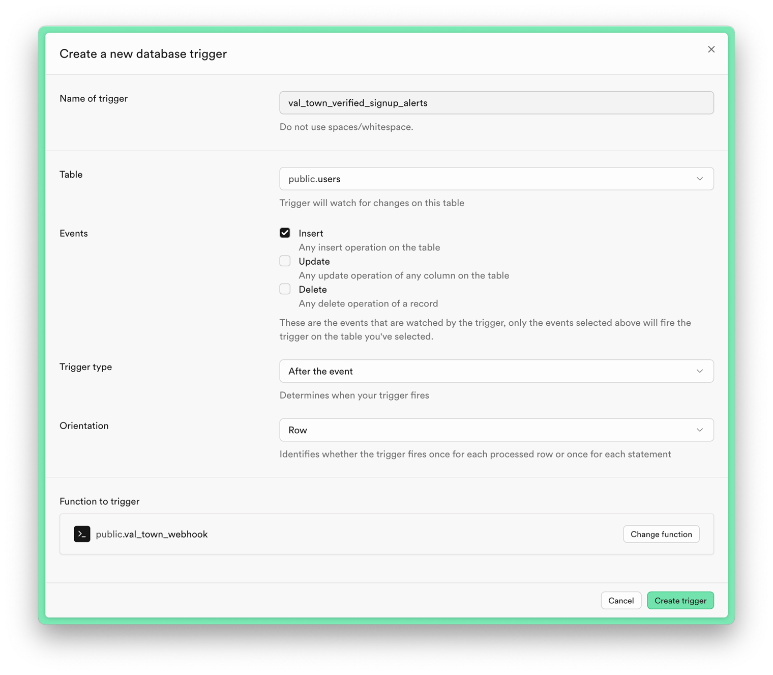 For quick Supabase webhook setup, refer to https://docs.val.town/integrations/supabase.