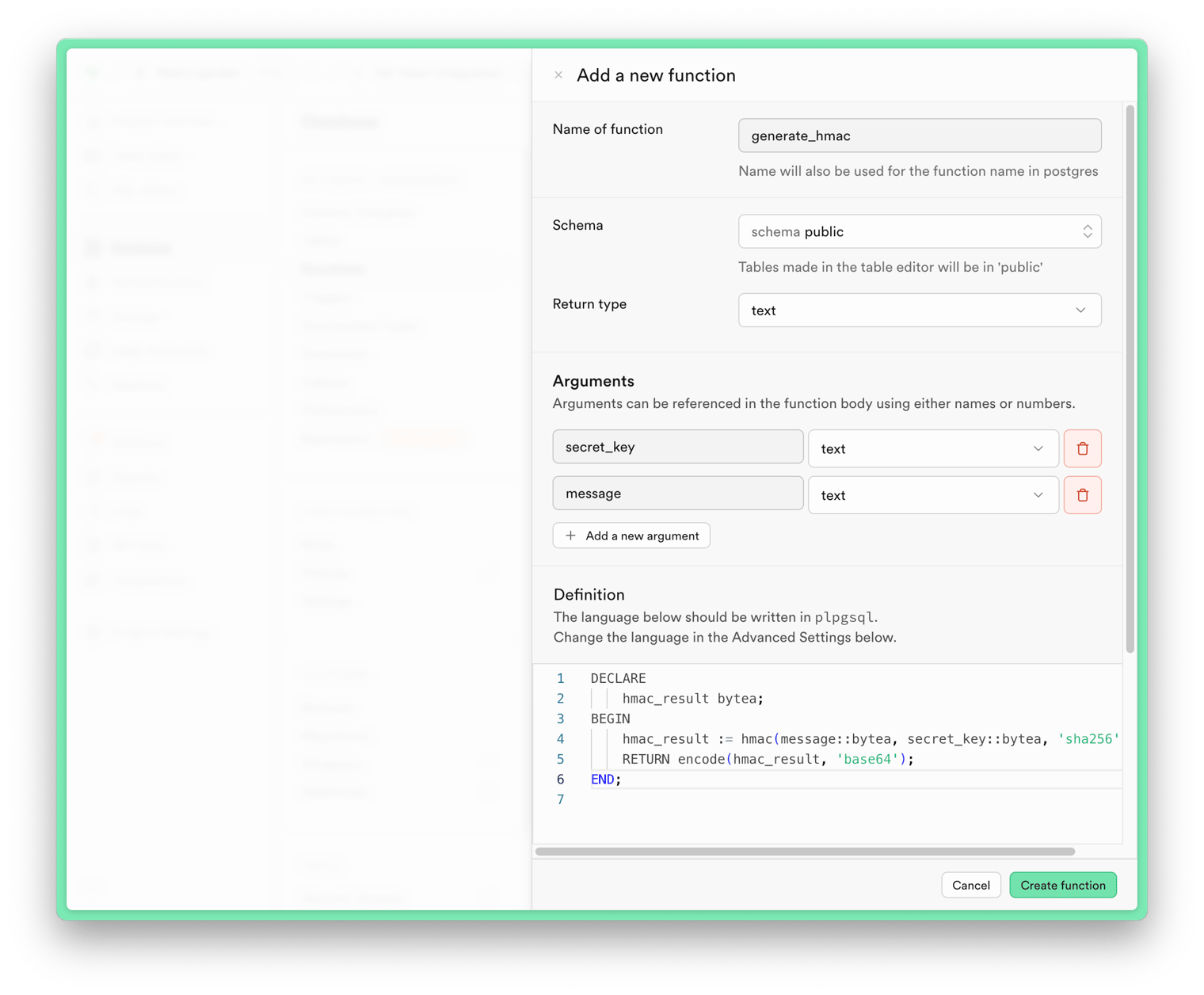 hmac_result := hmac(message::bytea, secret_key::bytea, 'sha256');