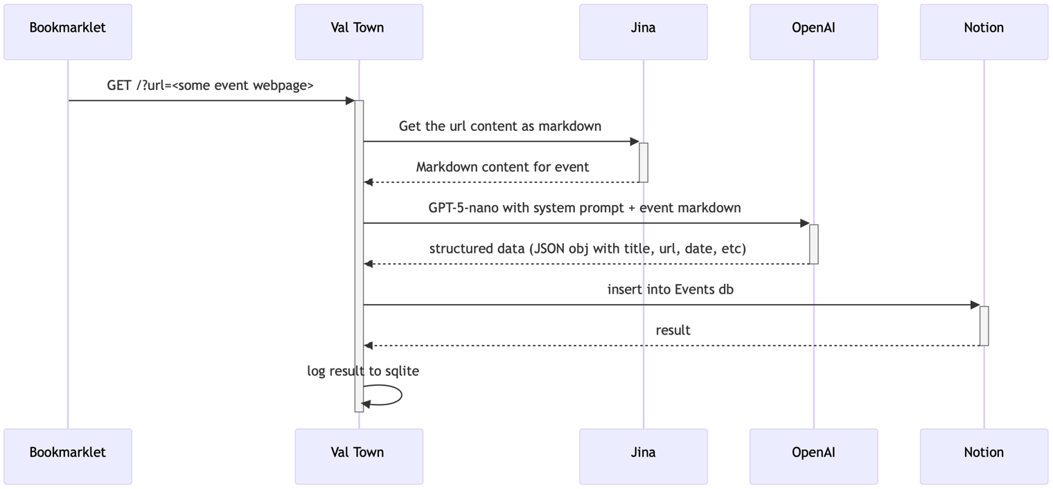 I grew tired of manually entering the time/place/other info into Notion. So I made this Val to serve as the backend for a bookmarklet — now I have one-click ability to munge an arbitrary event webpage → structured data → Notion db.