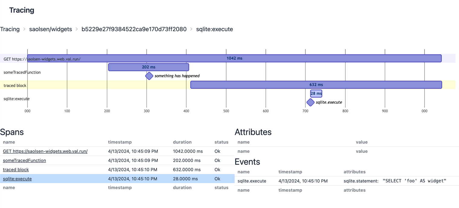 sqliteis a traced version of the val town sqlite client. Just import it and use it like you would use https://www.val.town/v/std/sqlite -