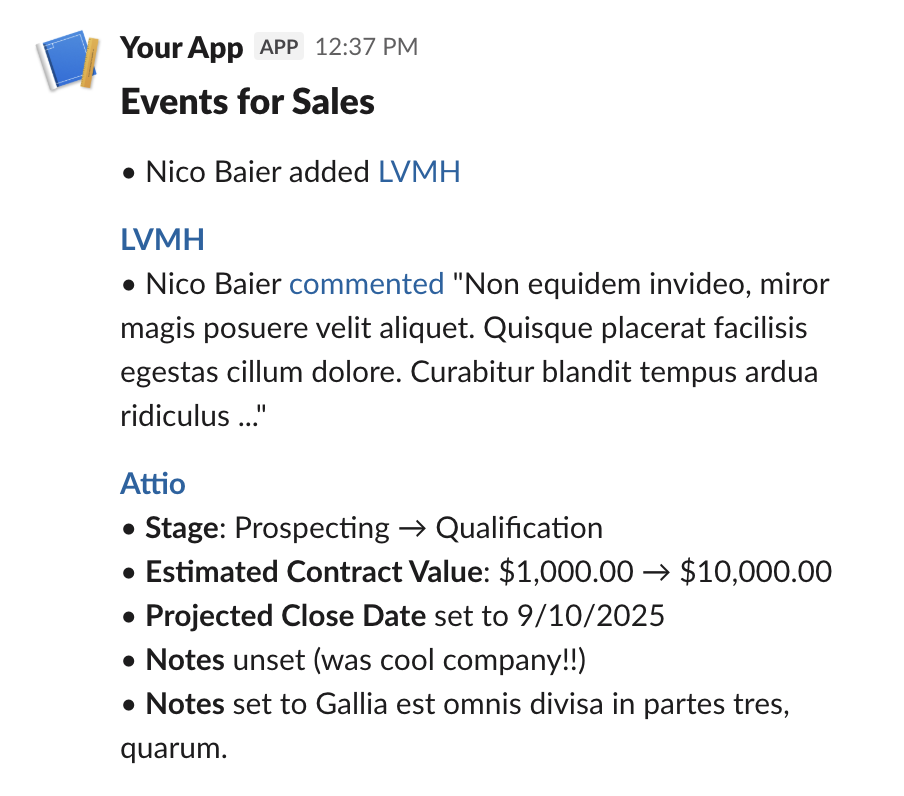 bootstrap.tsto initialize the database with the current state of your configured lists. - Go trigger some Attio events and see the message in Slack! (If you want them