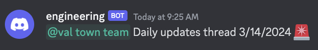 Every weekday at 9am EDT send a message to our team's #engineering Discord channel to start a thread to remind us to do our standup.