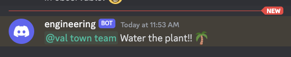 Every Monday at 9am EDT send a message to our team's Discord channel to remind us to water our plant.