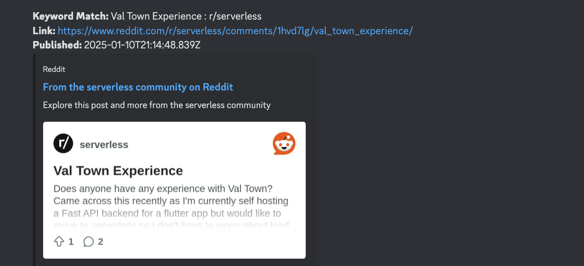 This val tracks mentions of "Val Town" and related terms on Reddit, filtering results from the last 7 days and sending alerts to a Discord webhook. Screenshot 2025-01-10 at 5.13.16 PM.png
