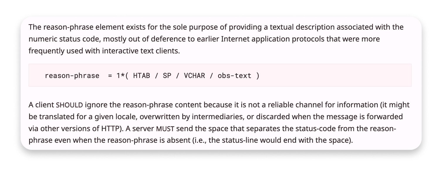 But there's one thing I didn't notice until yesterday. A quirk that was included in the HTTP 1.1 specification with an authors note that it's mostly there for historical reasons: the reason-phrase.
