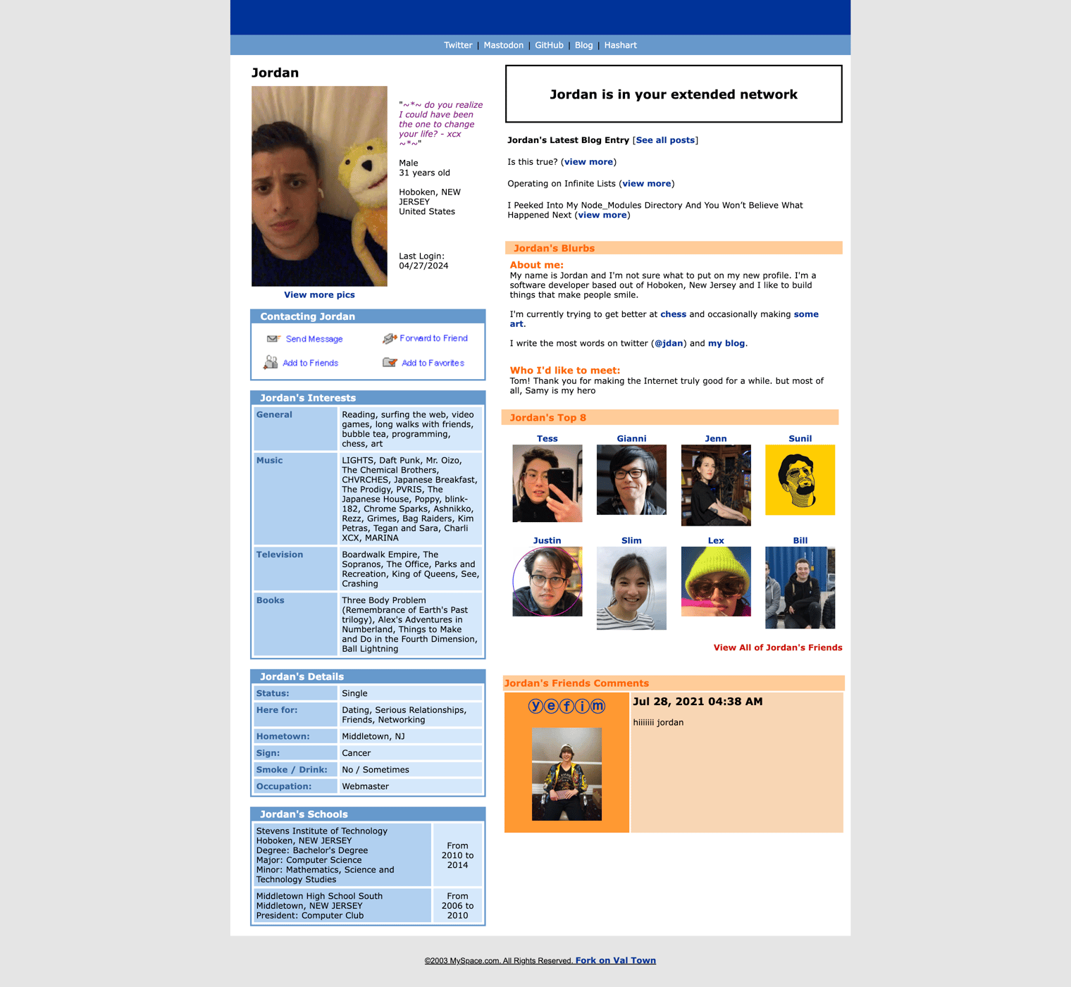 Create your own Myspace profile, deployed to Val town. https://jdan-myspace.web.val.run