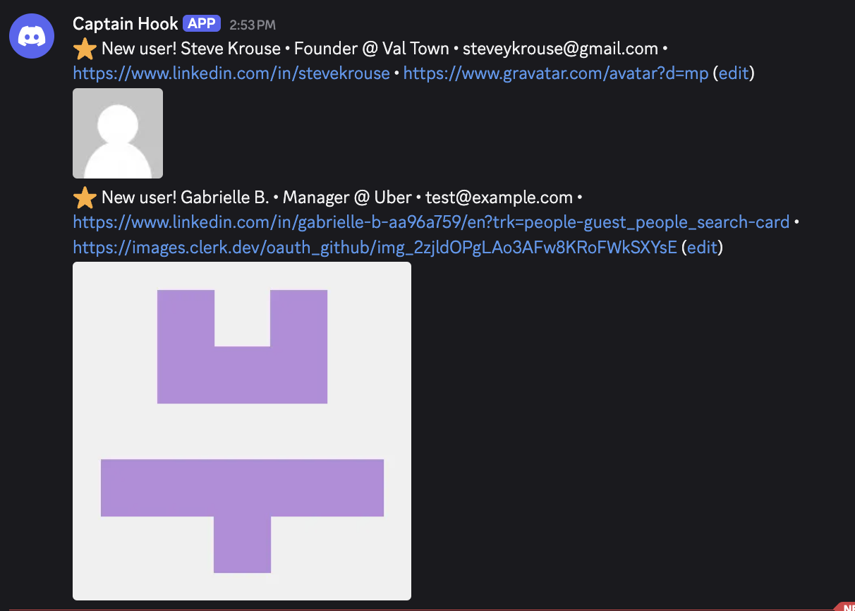 This demo uses Clay like an API to automatically enrich new user signups and send notifications to Discord.