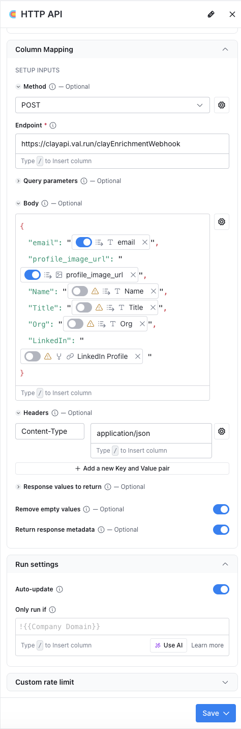 Note: Setting up the webhook like this lets you transform / filter the data before sending it over to Clay. It also helps with error handling and give you logs in Val Town for observability. Otherwise, you could set up the webhook directly from the source ie. Clerk, Stripe etc.