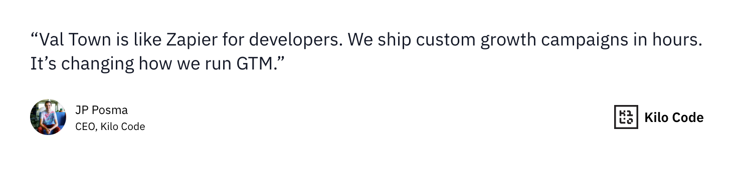 Startups like PostHog, Kilo Code, Stainless, and Scalar are using Val Town to automate workflows between GitHub, Clerk, Slack, Clay, and more.