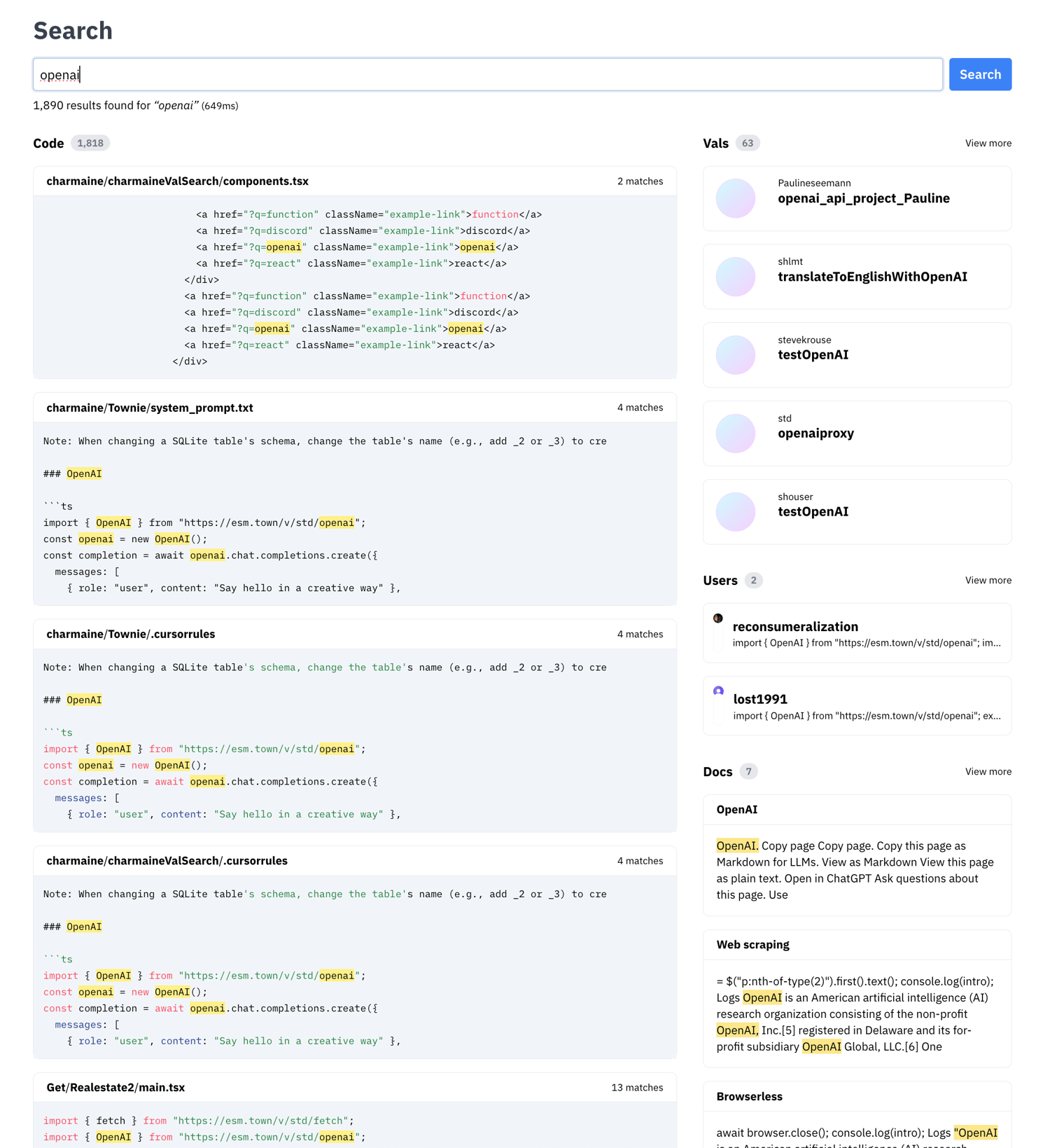 We rebuilt Val Town Search for the multi-file vals. It's much faster and gives exact matches. (It runs on Val Town SQLite, and uses like.) It searches across public val source code, usernames, and our docs.