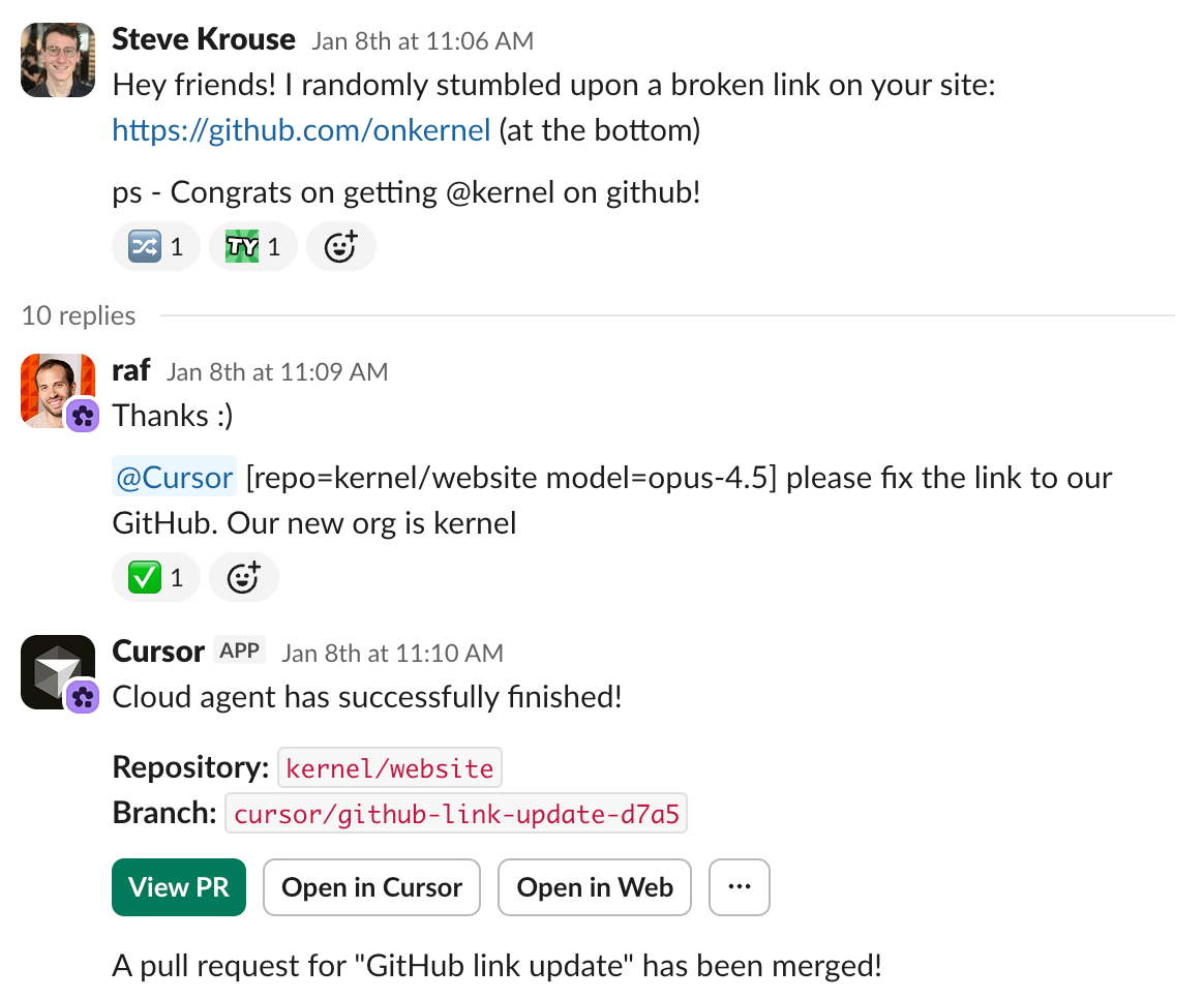 Which API is better to work with for automations/devtools? I've created a handful of Slack bots and found the ecosystem sprawling yet capable. I have less experience with Discord bots, but the ones I've set up have been easy enough. This is important because Slack agents are an emerging pattern. When Steve reported a typo on Kernel's website in our shared Slack channel, Raf asked Cursor bot to fix it right there, and it responded with a PR link and preview URL!