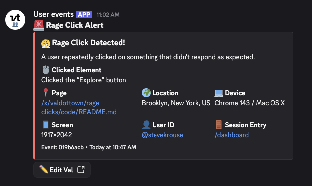 When PostHog detects a rage click, it sends a webhook to this val containing: