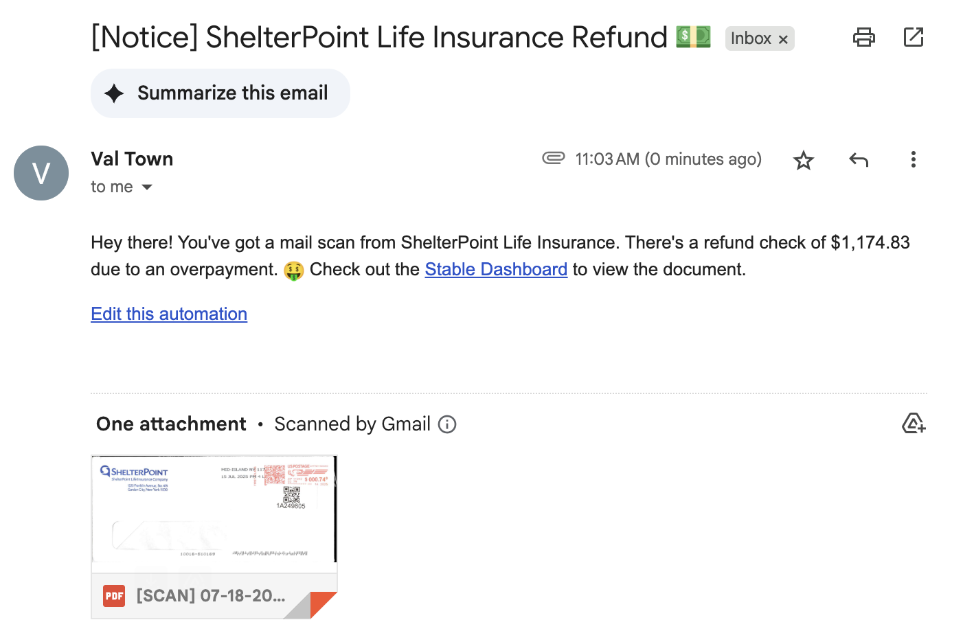 At Val Town, we use a physical mail service, Stable, that receives our mail, scans it, and sends me an email with the scanned PDF. I rarely click into these emails, partly because the subject lines are always a very boring "(1) Stable document scans from IRS...". This val spices those up by sending them to ChatGPT: